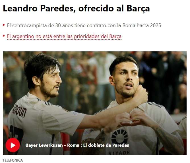 补强中场帕雷德斯被引荐给巴萨 优先级排在奥纳纳和梅里诺之后