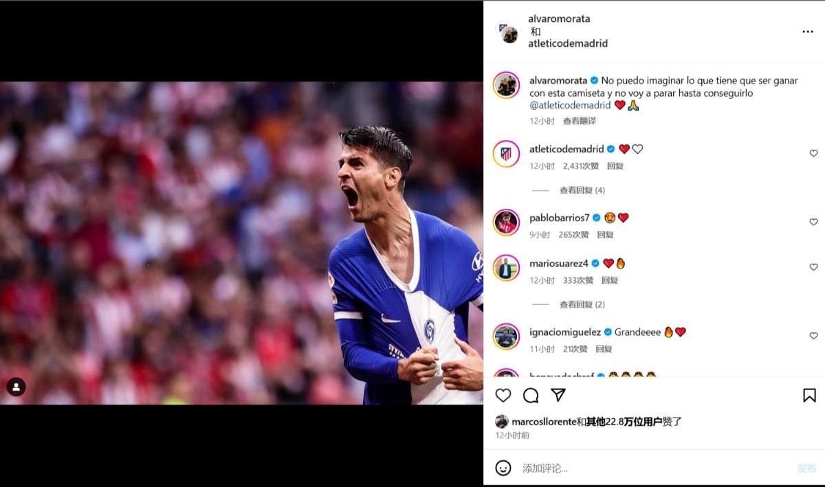确认留队!莫拉塔社媒自宣:无法想象身穿马竞球衣获胜会是什么样