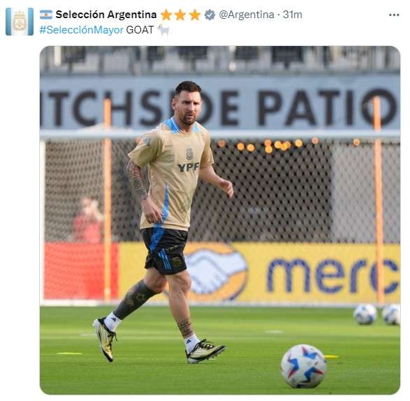 阿根廷国家队官方社媒晒梅西训练照并配文:GOAT