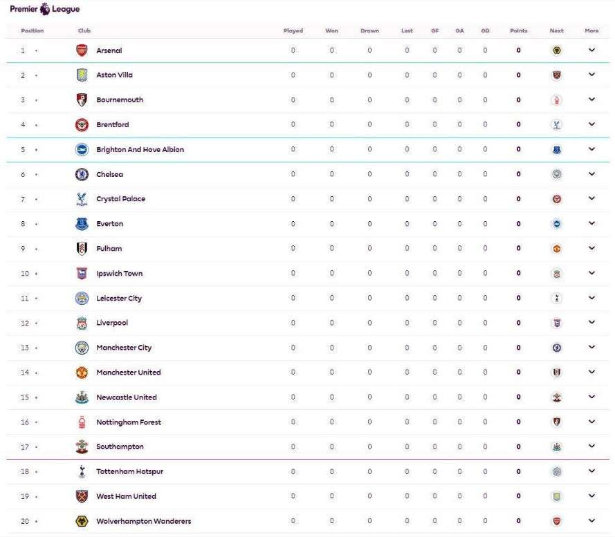 新赛季开始!英超积分榜重置 阿森纳重返榜首