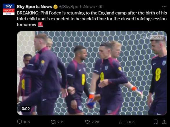 能赶上16强战!天空体育:福登正返回英格兰训练营