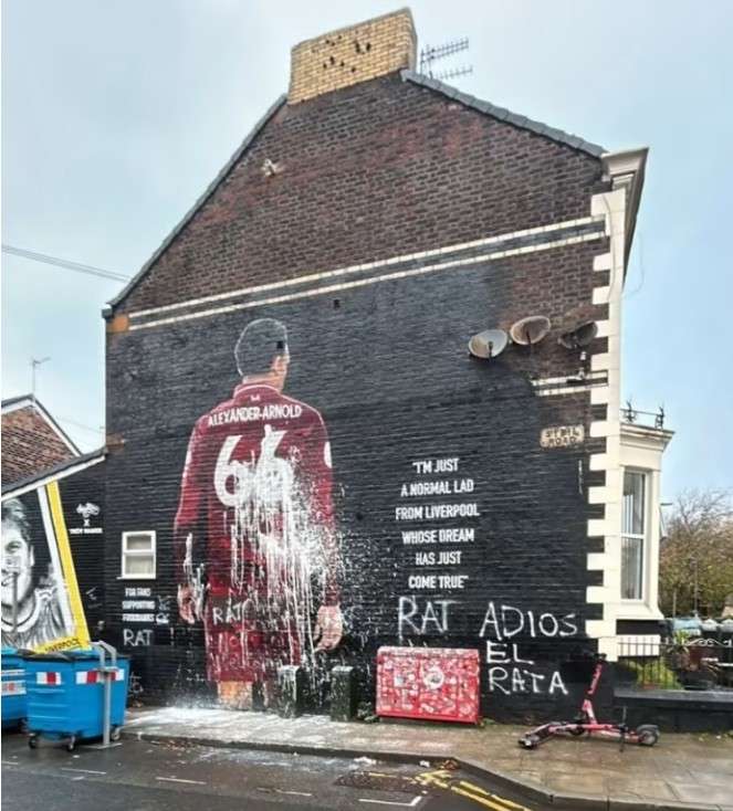 阿诺德在利物浦的壁画今晨惨遭污损 被涂鸦大字:“老鼠、再见吧”