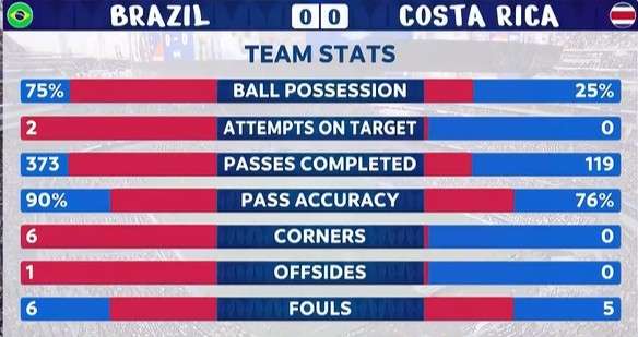 美洲杯半场数据:桑巴军团控球率超过7成 哥斯达黎加0射正