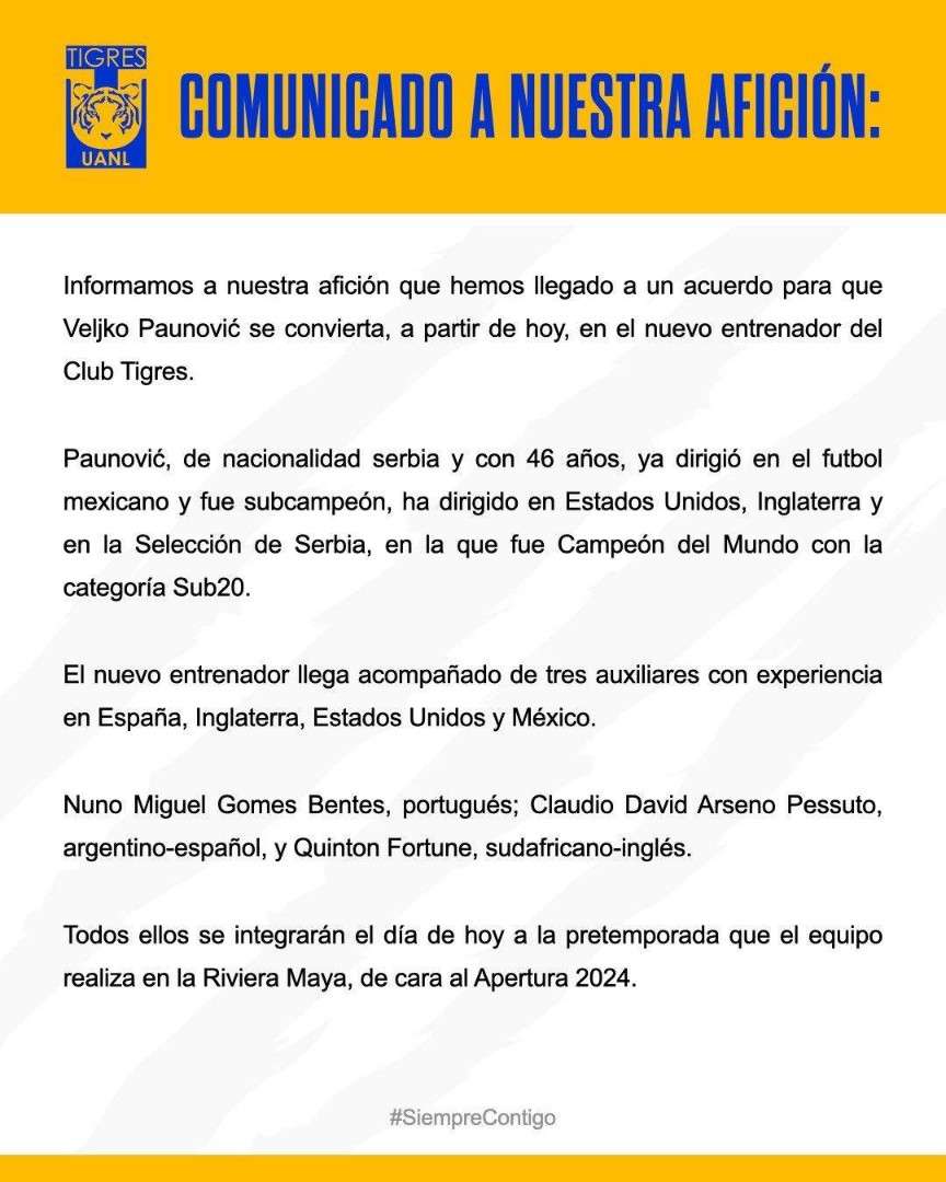 官方:前瓜达拉哈拉主教练保诺维奇正式成为老虎大学新任主帅