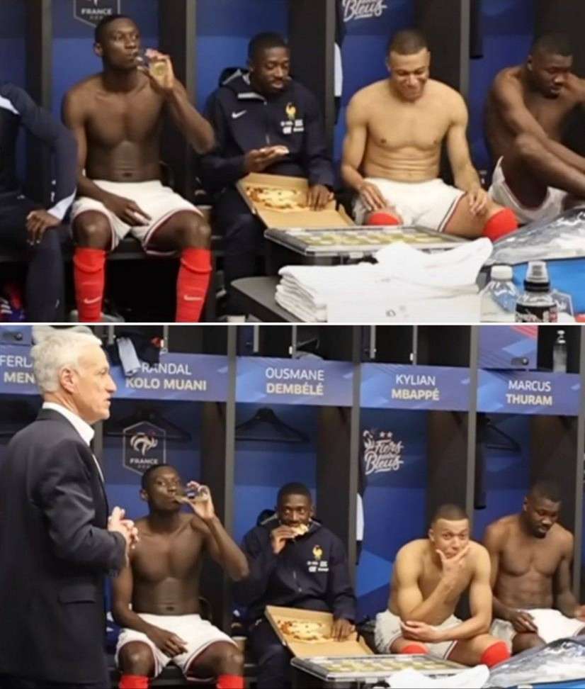 法国昨日战胜卢森堡后 登贝莱更衣室内狂炫披萨 姆巴佩在一旁偷笑