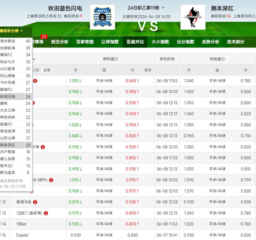 周六101日职乙:秋田蓝闪电VS熊本深红