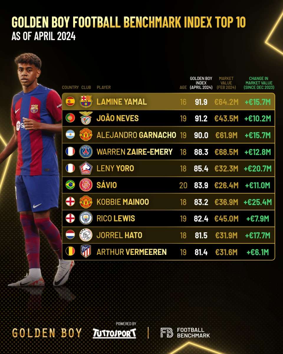 2024金童奖排名 亚马尔持续领跑 前10候选人中梅努身价上涨最