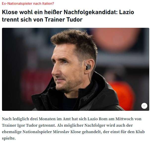 图多尔与俱乐部闹翻辞职 拉齐奥选帅瞄准克洛泽
