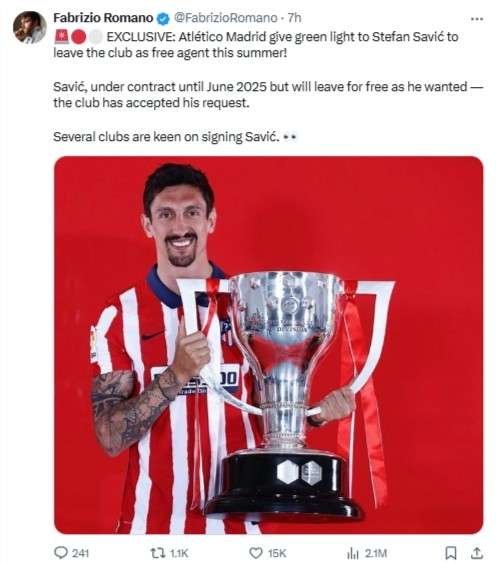 告别老妖!罗马诺:马竞已经同意萨维奇今夏自由身离队