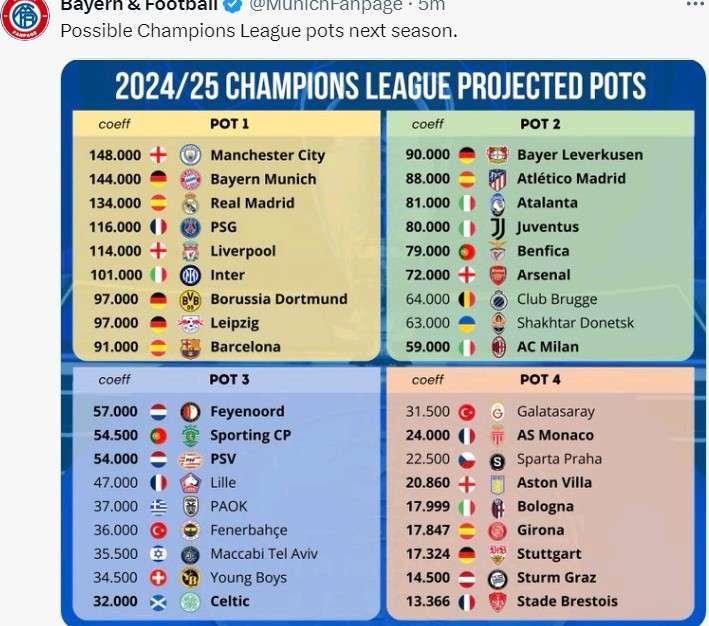 下赛季欧冠分档:皇萨仁城种子队 药厂阿森纳尤文米兰二档