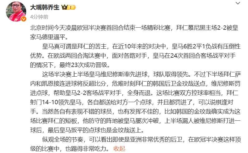 韩乔生:金玟哉成拜仁最大短板 亚洲顶级后卫踢欧冠半决赛也很吃力