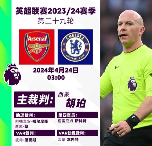 英超联赛第三十四轮主裁名单出炉:胡珀主哨枪手对阵蓝军