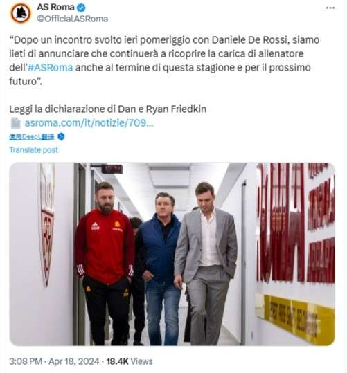 他留下!罗马官方:德罗西将在本赛季以及未来继续担任主帅