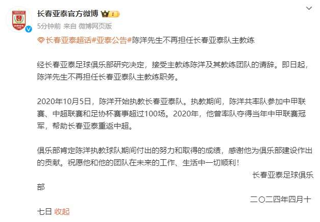 官方:长春亚泰主教练陈洋下课 新赛季带队6轮1胜5负联赛垫底