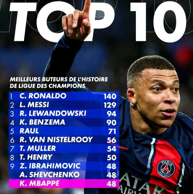 姆巴佩欧冠总进球数48球追平伊布舍瓦 并列历史射手榜第9