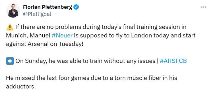 德天空记者:诺伊尔已经恢复训练 或将随队飞往伦敦备战与阿森纳的比