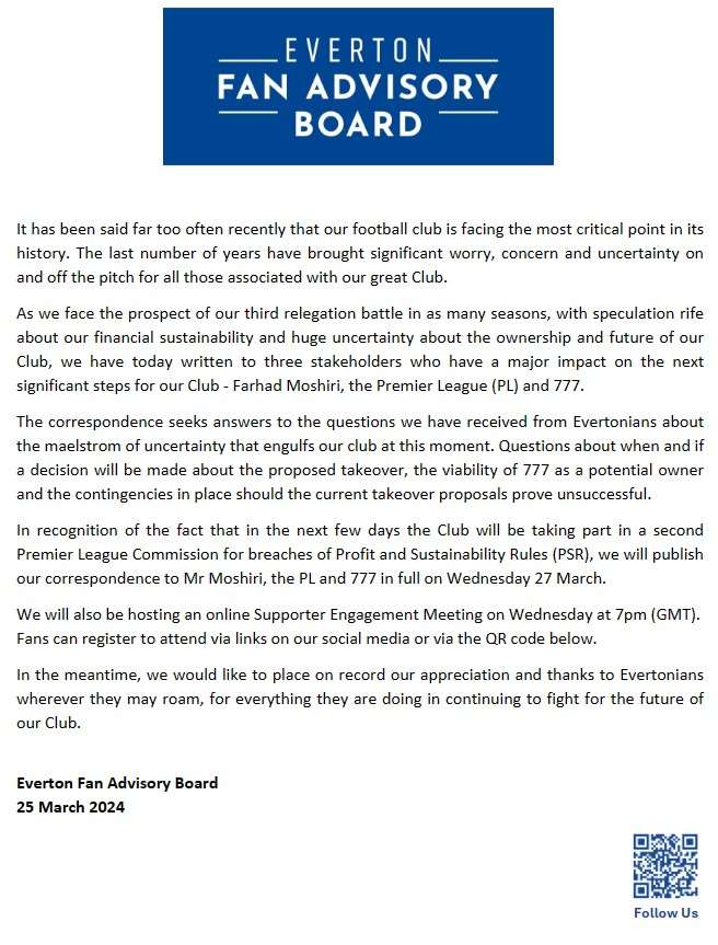 埃弗顿球迷组织致函莫希里、英超和777 质疑是否有相关收购安排和