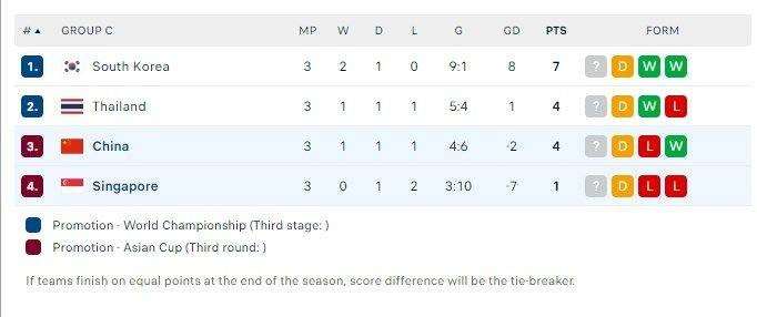 三轮战罢C组排名未变动 国足积4分排名第3位