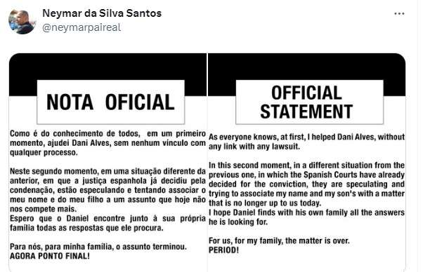 内马尔父亲发文否认为阿尔维斯支付保释金 称已经与此事无任何瓜葛