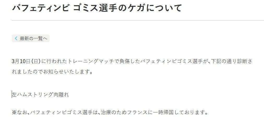 官方:戈米斯左腿肌肉撕裂 已返回法国治疗
