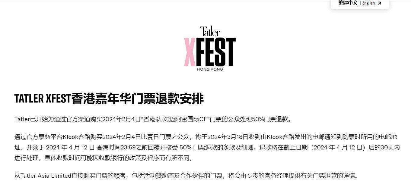 主办方公布梅西缺阵退款方案:门票退一半 交通住宿不退款