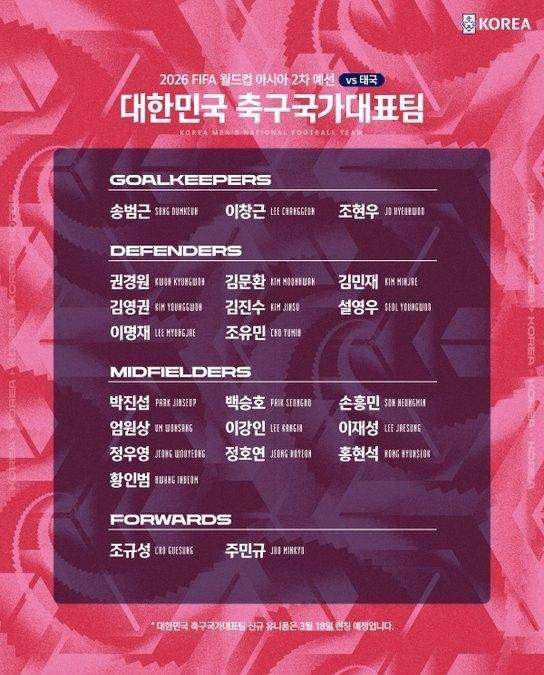 韩国男足最新一期大名单:孙兴慜、金玟哉领衔 李刚仁在列