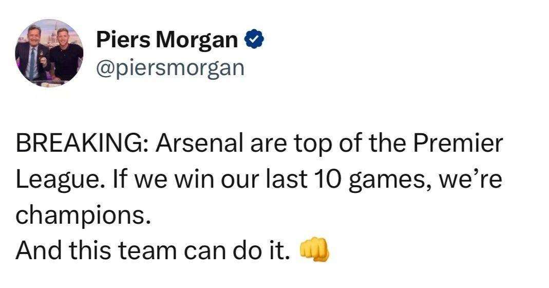 你信吗?摩根:阿森纳只要赢下最后10场就是冠军