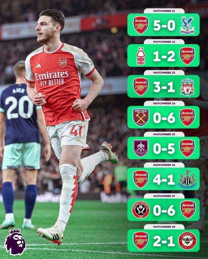 阿森纳成为英超第四支自然年开局8连胜球队 此前三队均最终夺冠
