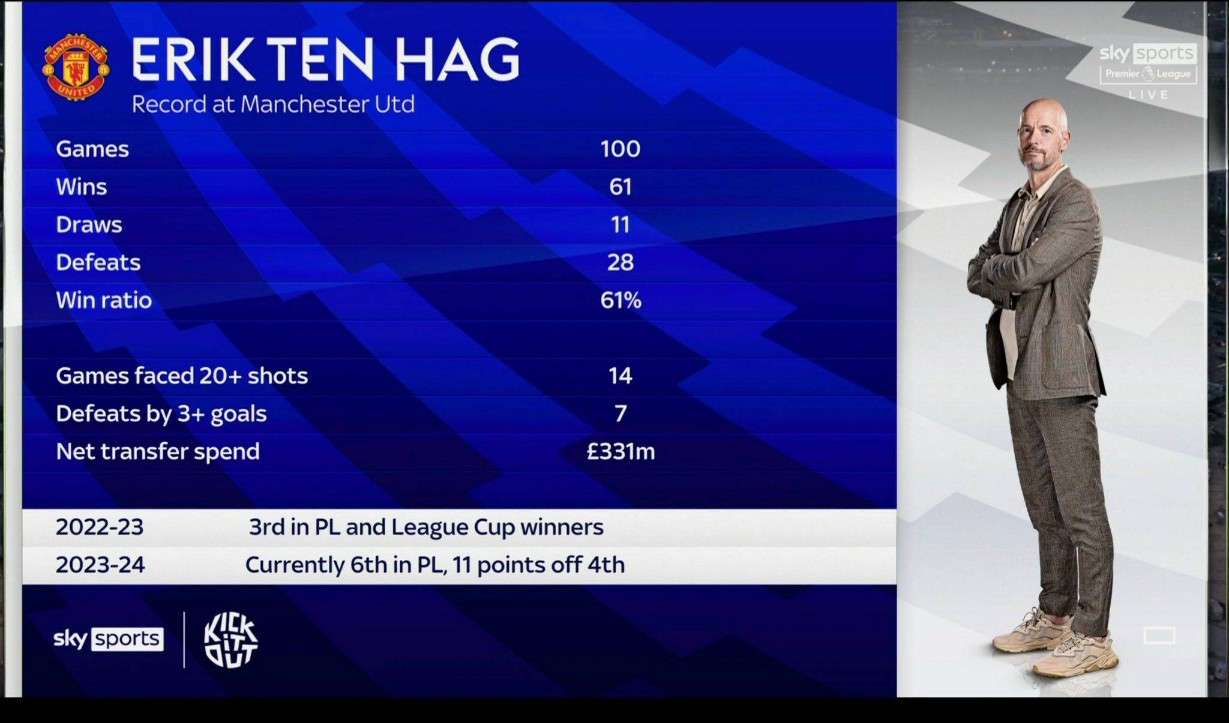 滕哈赫曼联执教百场战绩一览:胜率61% 净支出3亿英镑 一个冠军