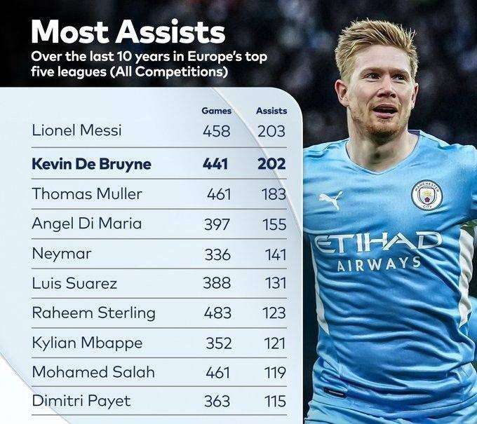 德布劳内位列过去10年五大联赛助攻榜第二 效率超越梅西