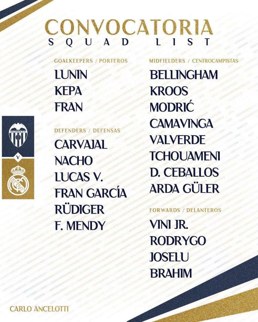 皇马公布客战瓦伦西亚大名单:贝林厄姆&何塞卢回归