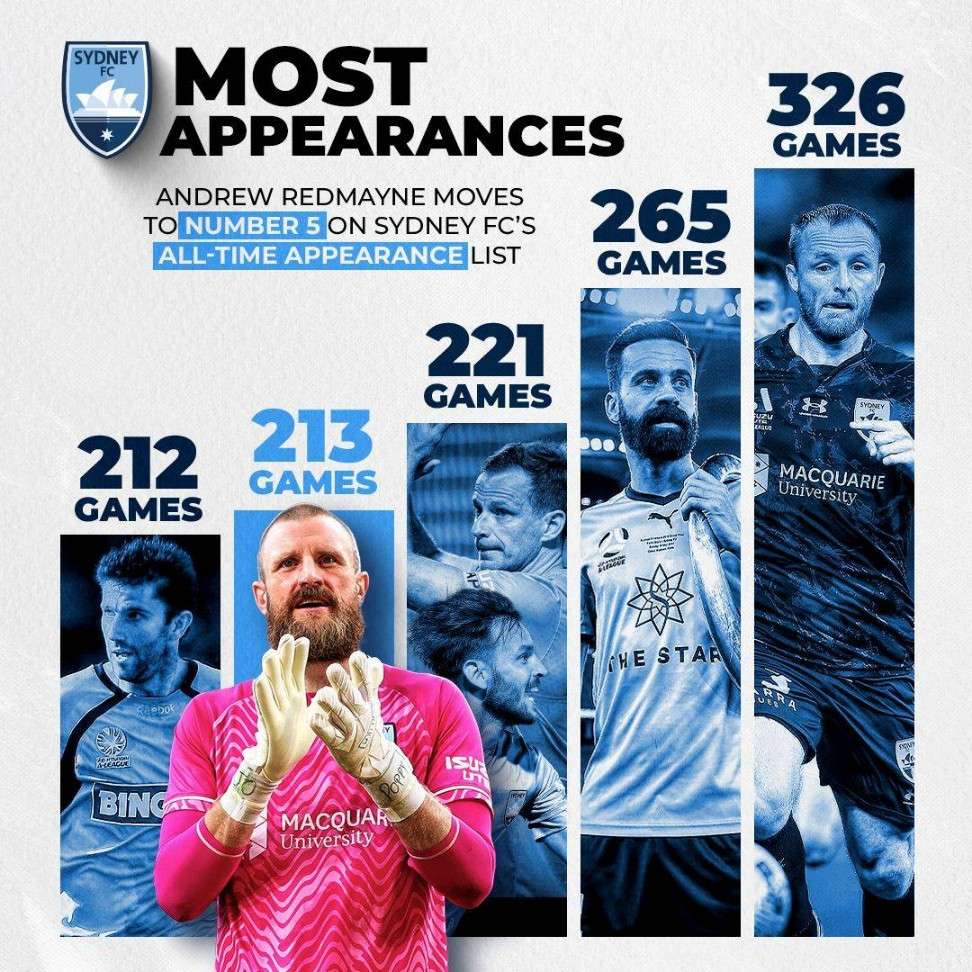 澳超传奇!雷德梅恩代表悉尼FC出场213次 跻身队史前5