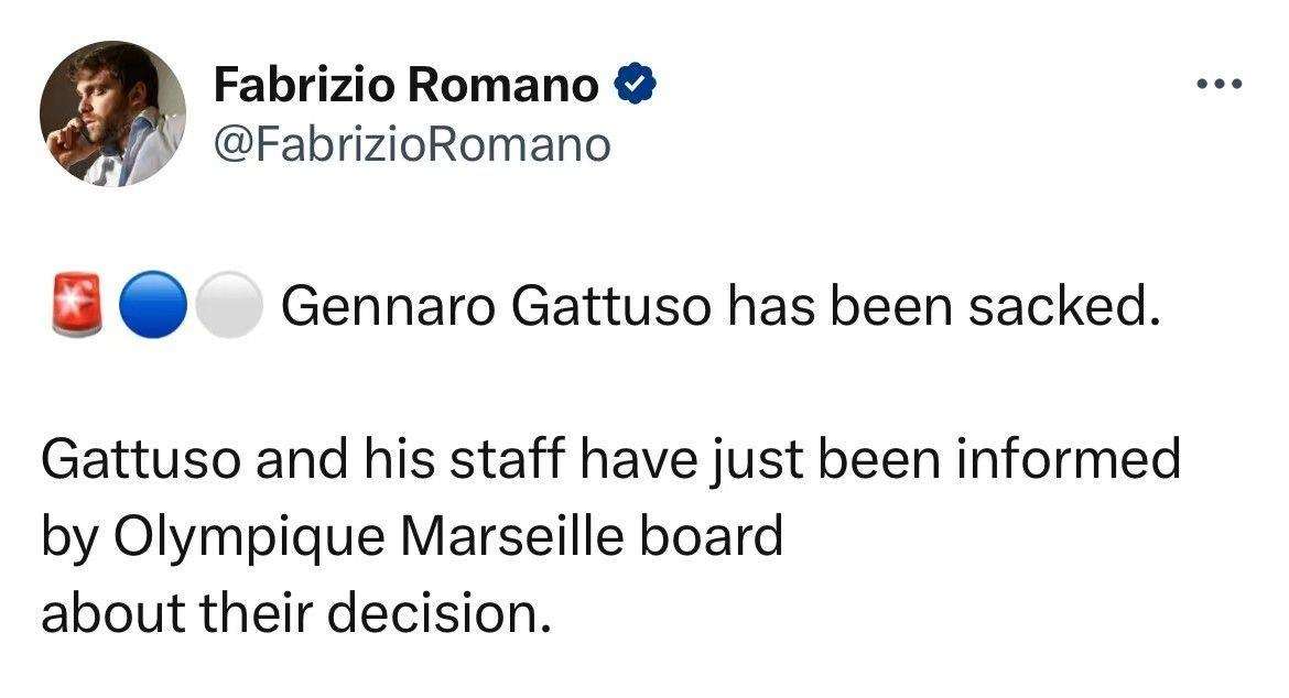 硬汉也无奈!罗马诺:马赛主帅加图索已经下课
