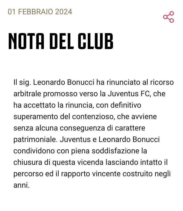 破镜重圆!尤文官方:博努奇放弃起诉 双方关系良好