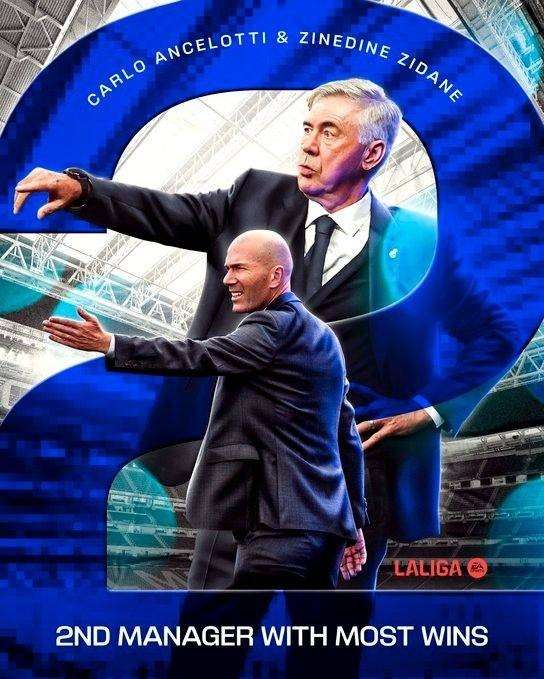安切洛蒂超越齐达内 成为皇马队史西甲胜场数第二的主教练