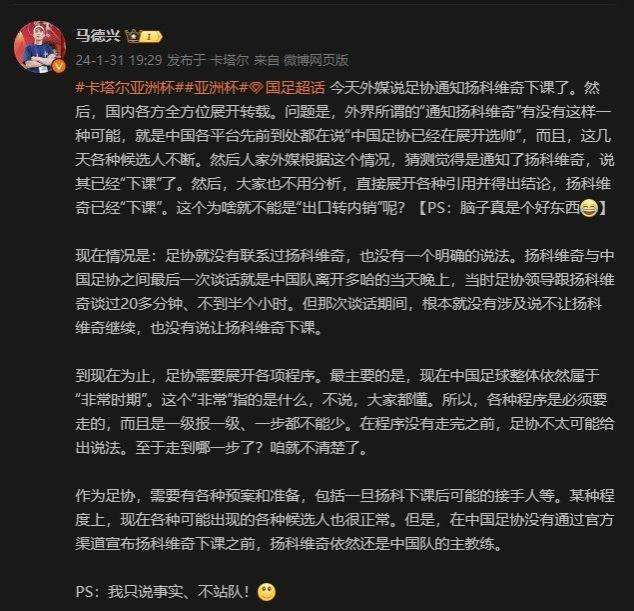 换帅新闻出口转内销?马德兴:扬科维奇被“下课” 他依然是国足主帅
