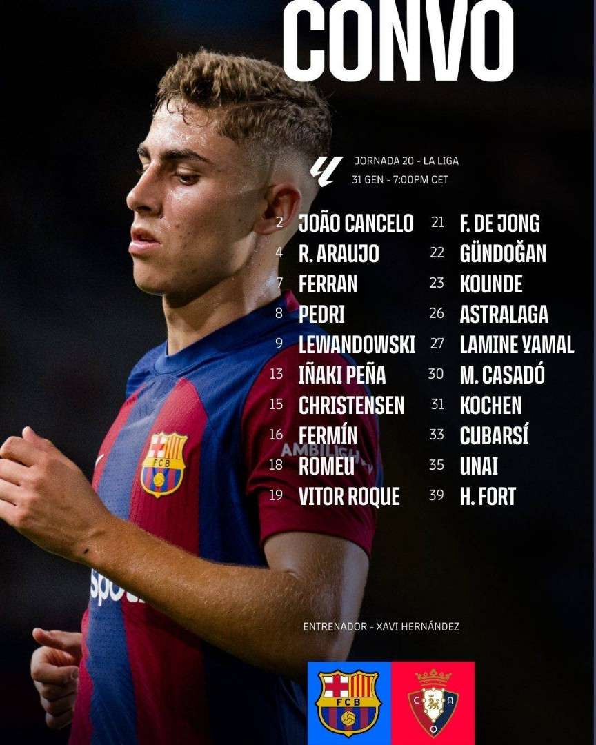 巴萨公布对阵奥萨苏纳大名单:莱万在列 菲利克斯缺席