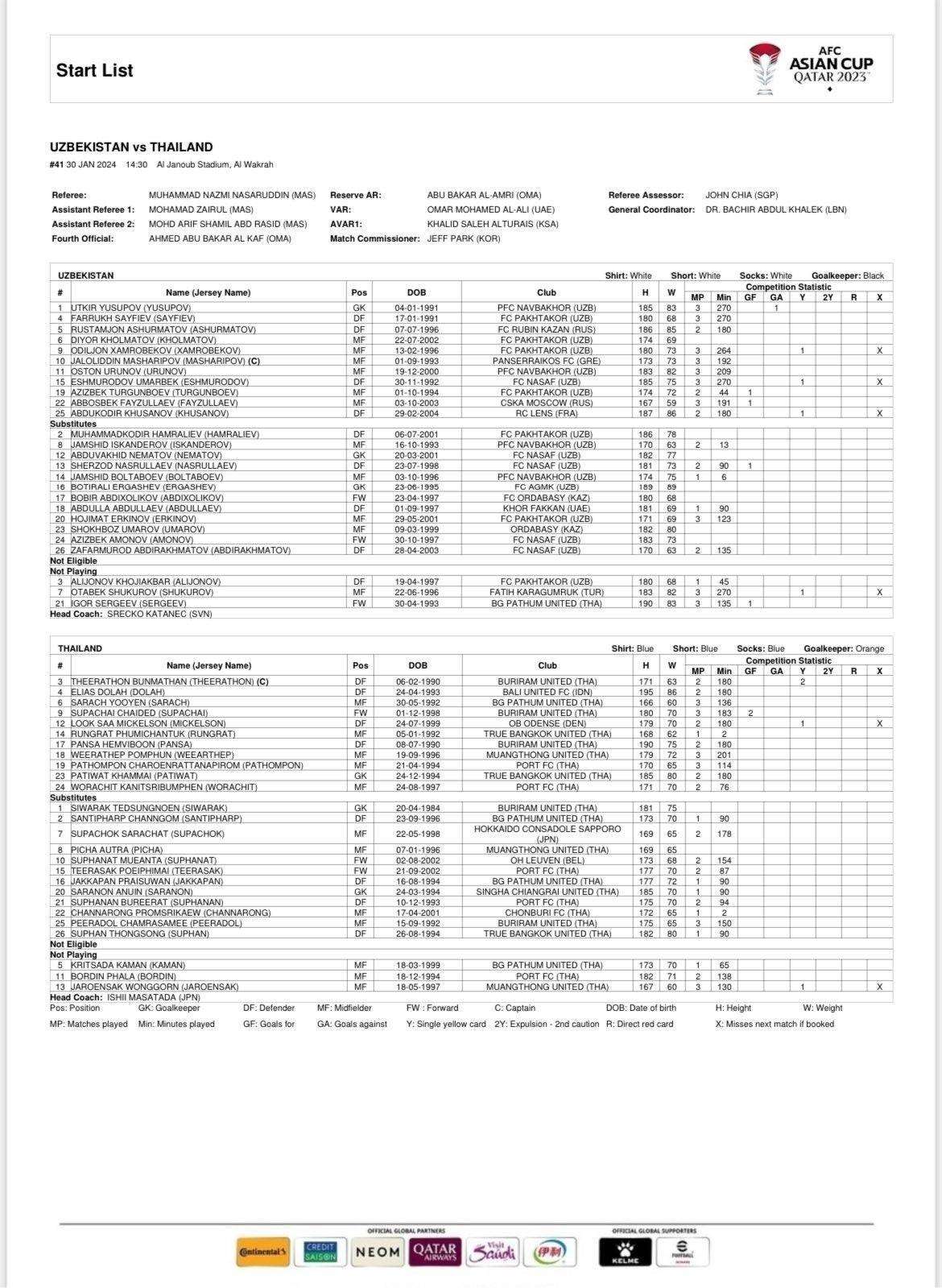 乌兹别克斯坦vs泰国首发:图尔根巴耶夫PK素巴猜 提拉通、沙拉奇