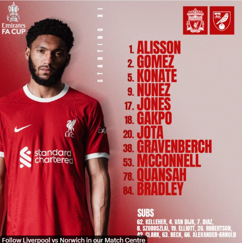 利物浦VS诺维奇首发:范戴克&阿诺德替补 努涅斯先发