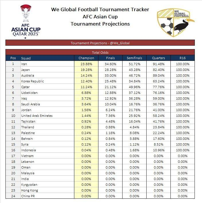 亚洲杯最新夺冠概率:伊朗升至第一 韩国仅排名第四