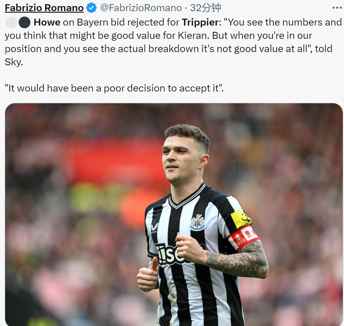 埃迪豪:拜仁对特里皮尔的报价不值一提 自信球员必将留队