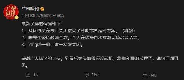 广州队刊更新球队情况:球员接受了分期或者延时方案