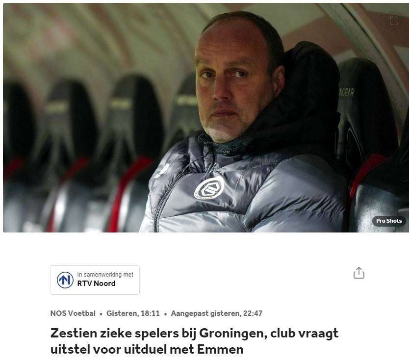 荷乙格罗宁根队内16人患病上吐下泻 俱乐部请求推迟与埃门的比赛