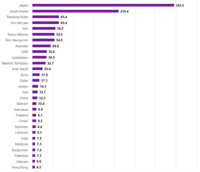 德转:孙兴慜一人身价超亚洲杯21队 国足位列第12
