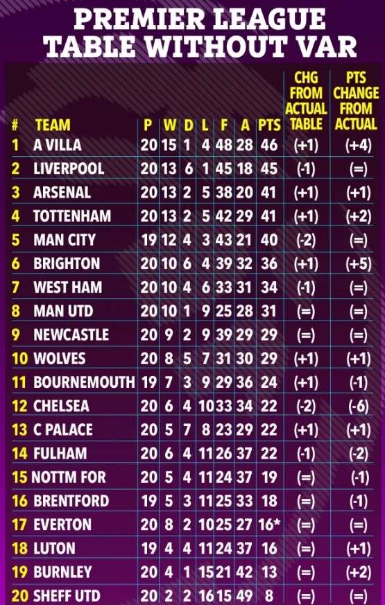 太阳报:若没有VAR 阿斯顿维拉位居榜首 切尔西比现在还会少6分