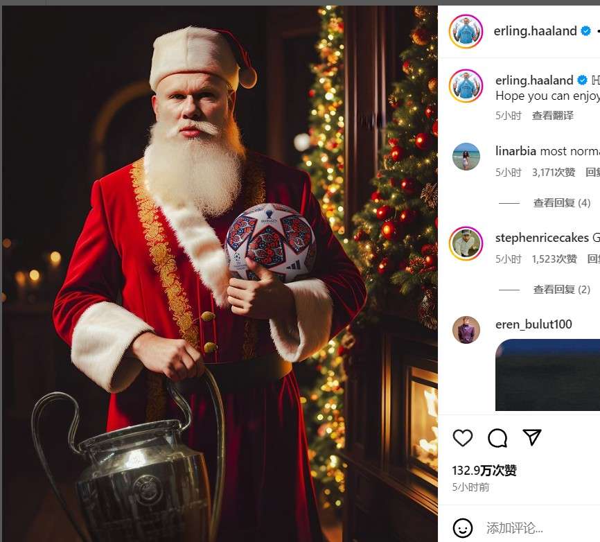 哈兰德化身圣诞老人送祝福 借机炫耀自己的欧冠奖杯