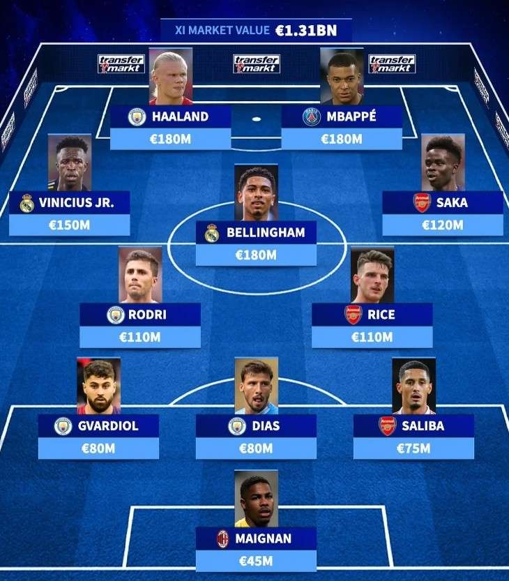 德转更新五大联赛最贵阵容:总价高达13.1亿欧 哈兰德、姆巴佩、