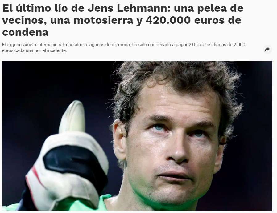 前德国国门莱曼与邻居起冲突竟挥舞电锯 被捕后辩称自己失忆