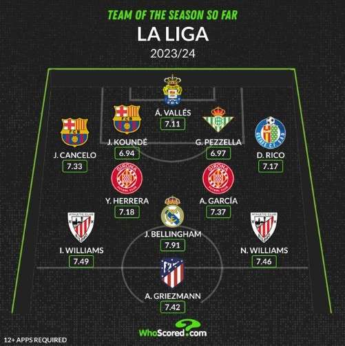 知名数据网站评选本赛季西甲最佳阵容:皇马仅贝林入选 巴萨两后卫在