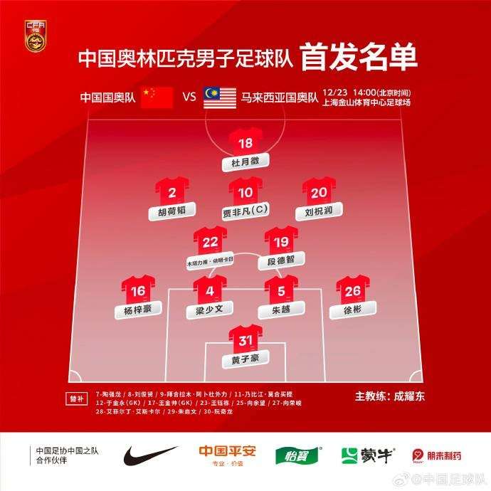 中国国奥vs马来西亚国奥首发:贾非凡领衔 胡荷韬、刘祝润先发出战